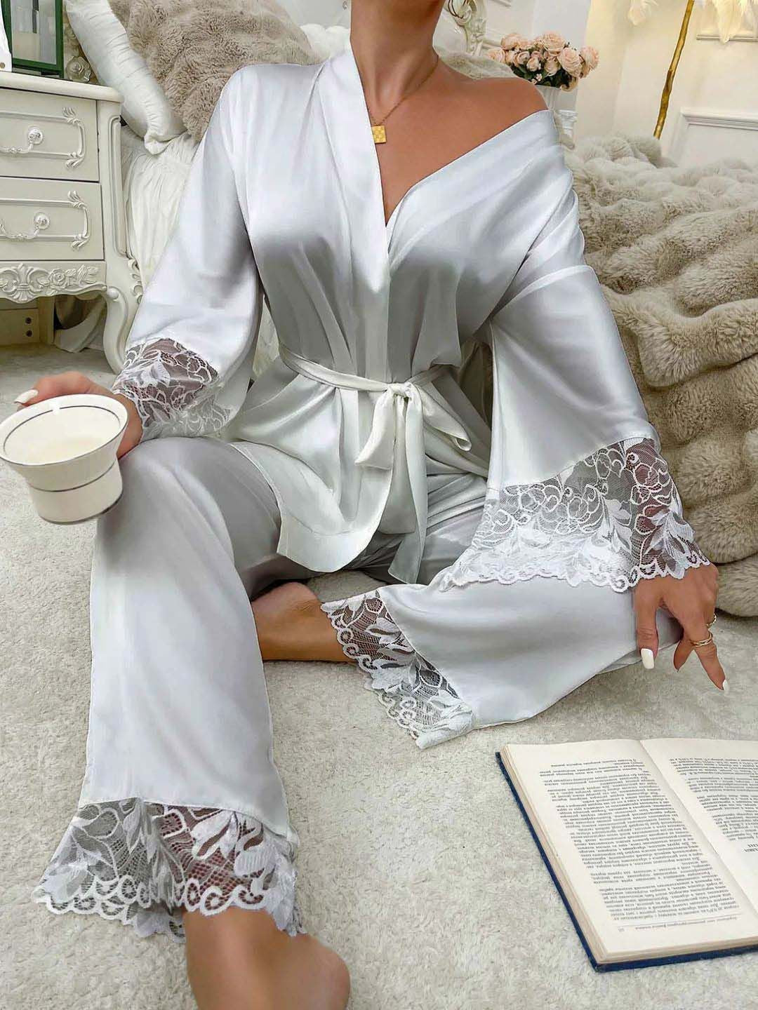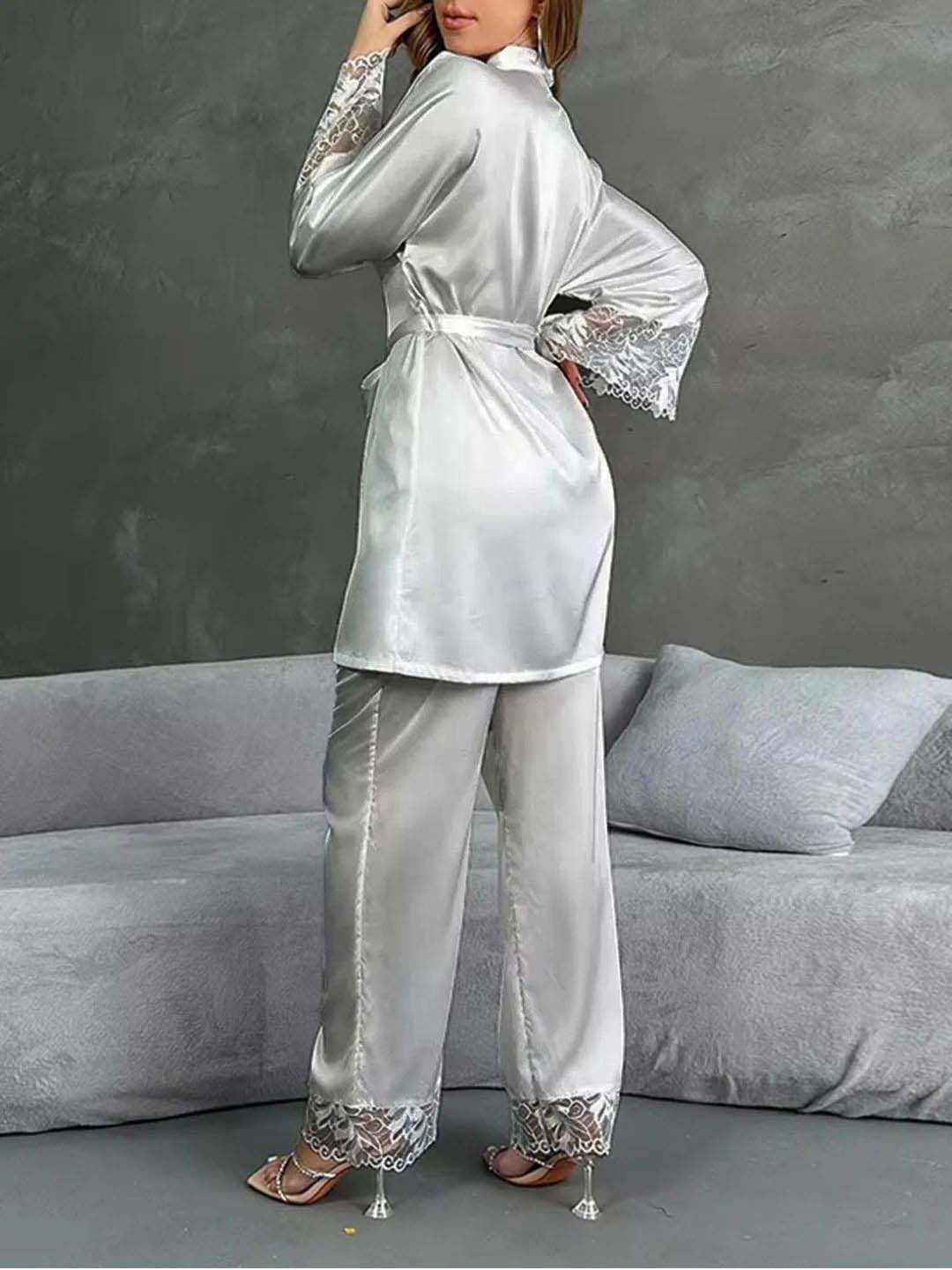 11002-Grey Satin Nightwear Set with Lace Trim | Luxury Sleepwear For Women