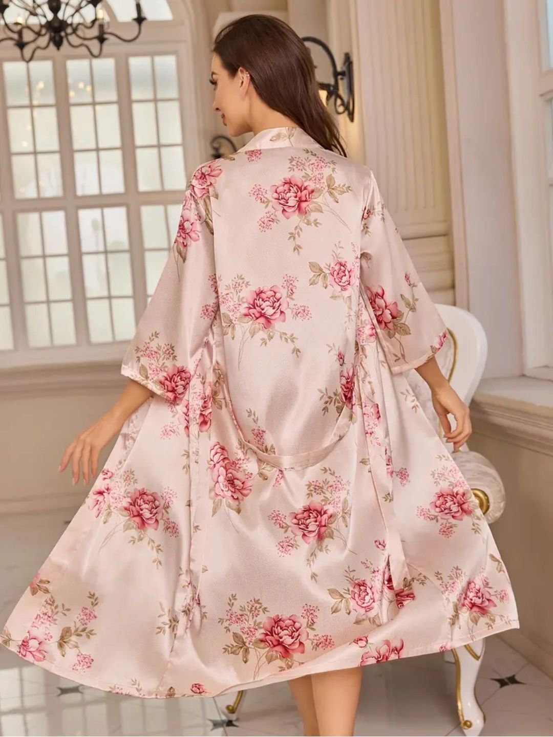 Make your nights more graceful with this pink floral satin robe set. Its romantic pastel hue and elegant floral design add a touch of sophistication to your nightwear collection. Style it with delicate jewelry or soft slippers for a complete cozy-luxe look that blends comfort with beauty.