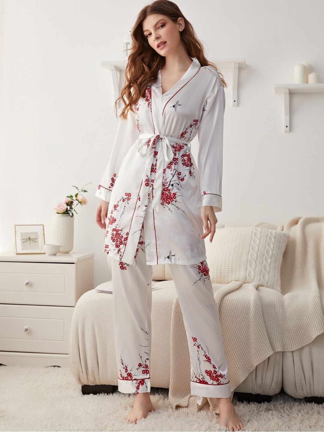 Elevate your nightwear wardrobe with this elegant satin pajama and robe set. Designed with a soft floral print and a flattering silhouette, this set blends comfort with luxury. Perfect for relaxed evenings, leisurely mornings, or stylish lounging, it offers a chic yet cozy feel that makes everyday unwinding feel special.