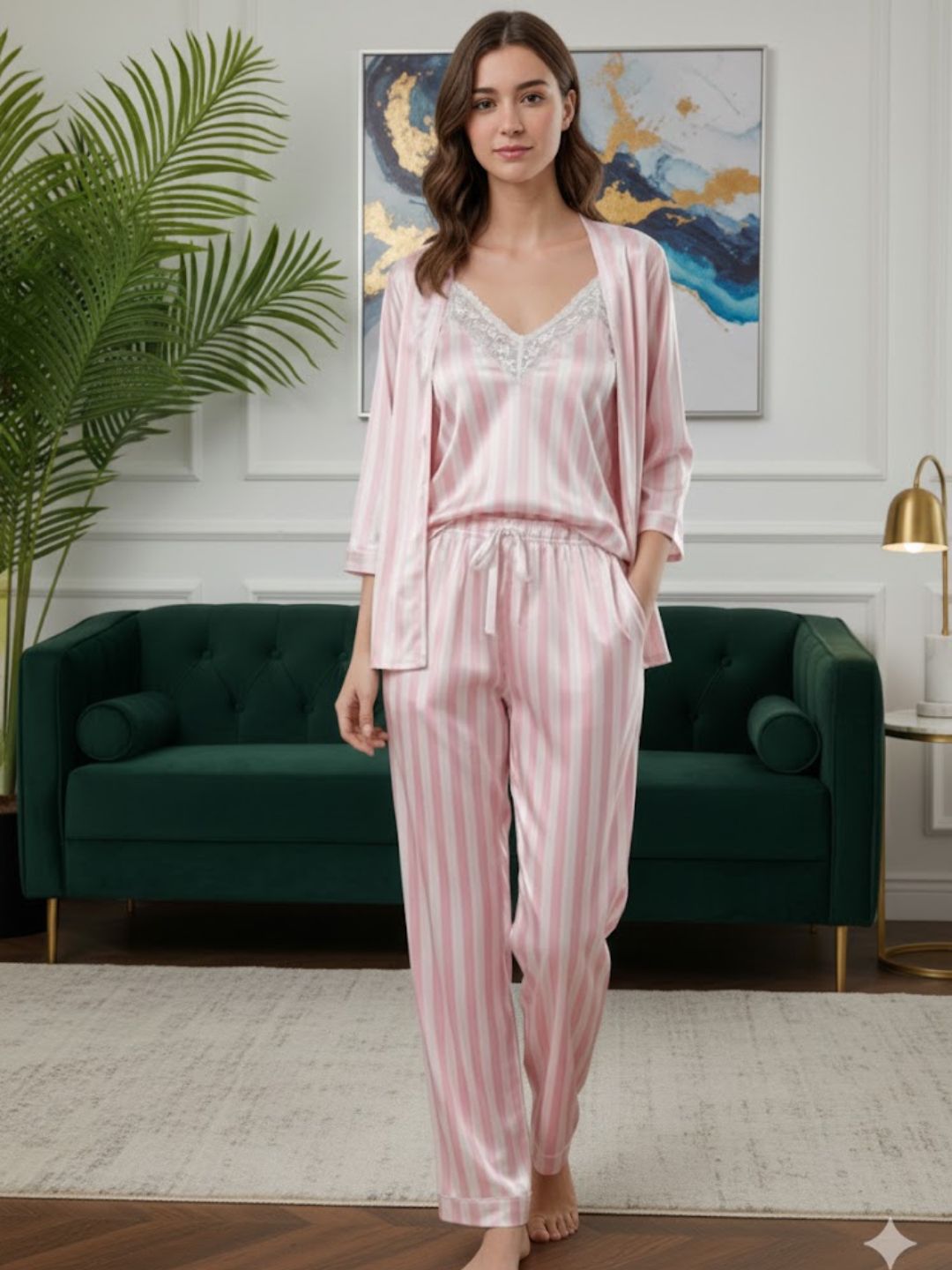 Upgrade your nightwear collection with this elegant three-piece satin nightwear set for women. The set includes a soft striped camisole with lace detailing, a matching open-front robe, and comfortable pyjamas. Crafted from smooth satin fabric, this set offers a luxurious feel while ensuring all-night comfort. Perfect for lounging, sleeping, or relaxing at home in style.