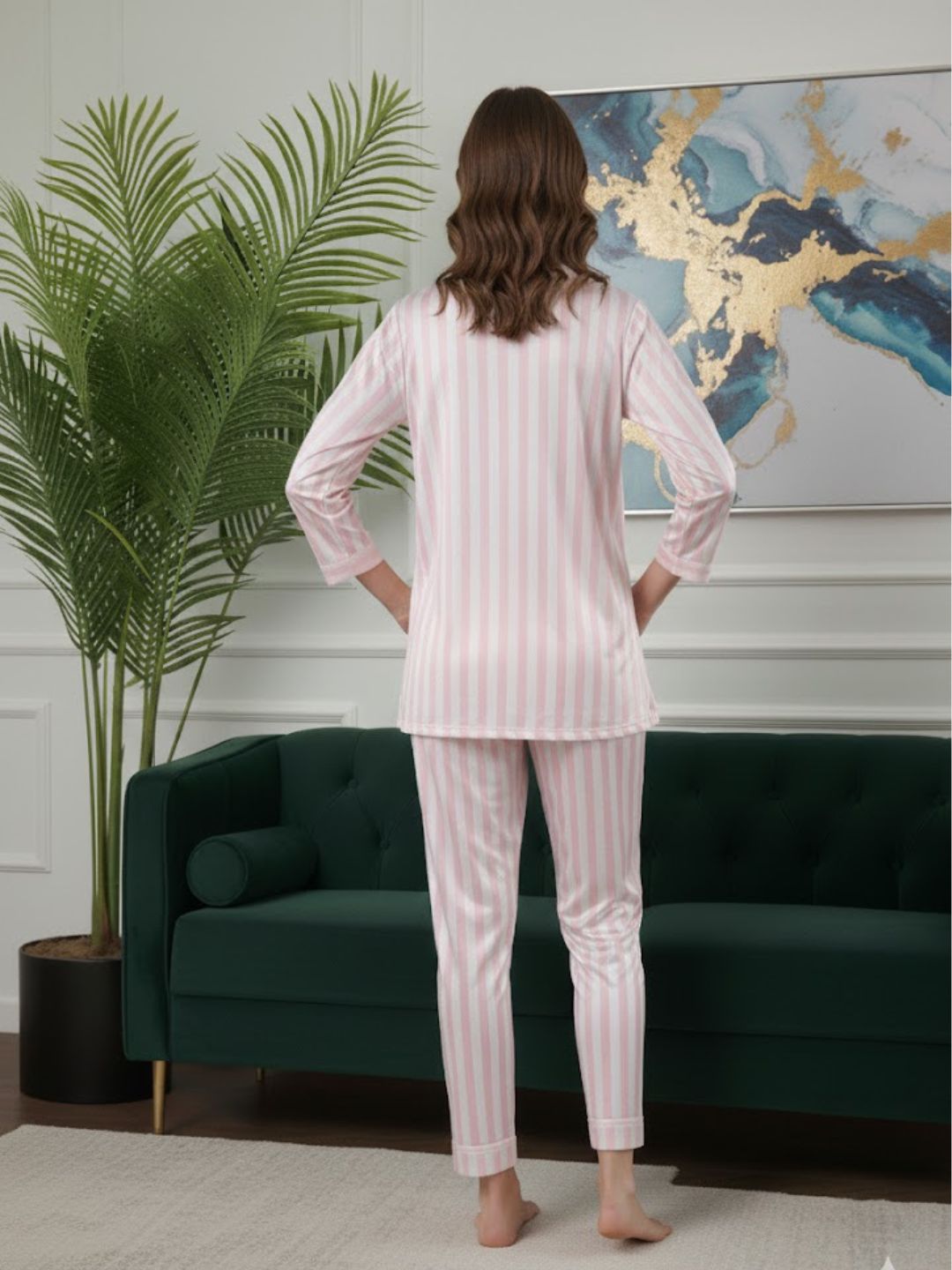 This premium nightwear set combines sophistication with everyday comfort. The delicate lace neckline adds a feminine touch, while the striped pattern keeps the look modern and stylish. Ideal for women who love chic and classy lounge wear.