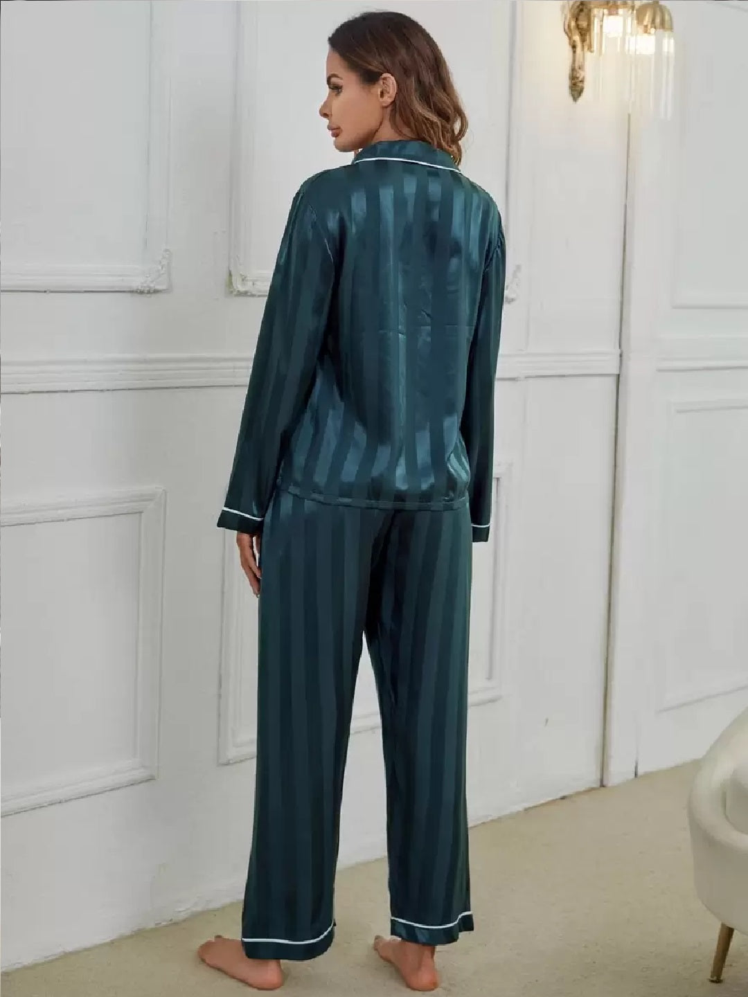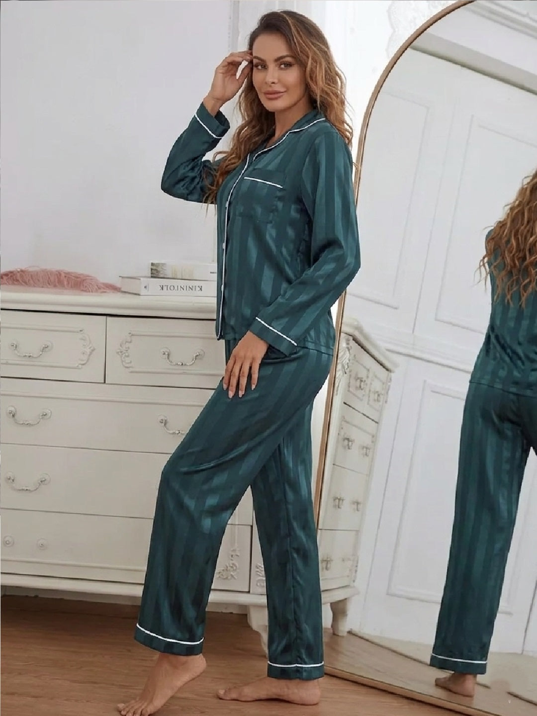 This stylish green night suit set features a classic shirt and pyjama combination crafted for ultimate comfort and elegance. The top comes with a notched collar, full button-down front, and contrast piping details that add a refined touch. The long sleeves and relaxed silhouette ensure ease of movement, while the matching full-length pants offer a comfortable fit with a clean finish. The subtle striped texture enhances the premium look, making it perfect for both lounging and sleeping.