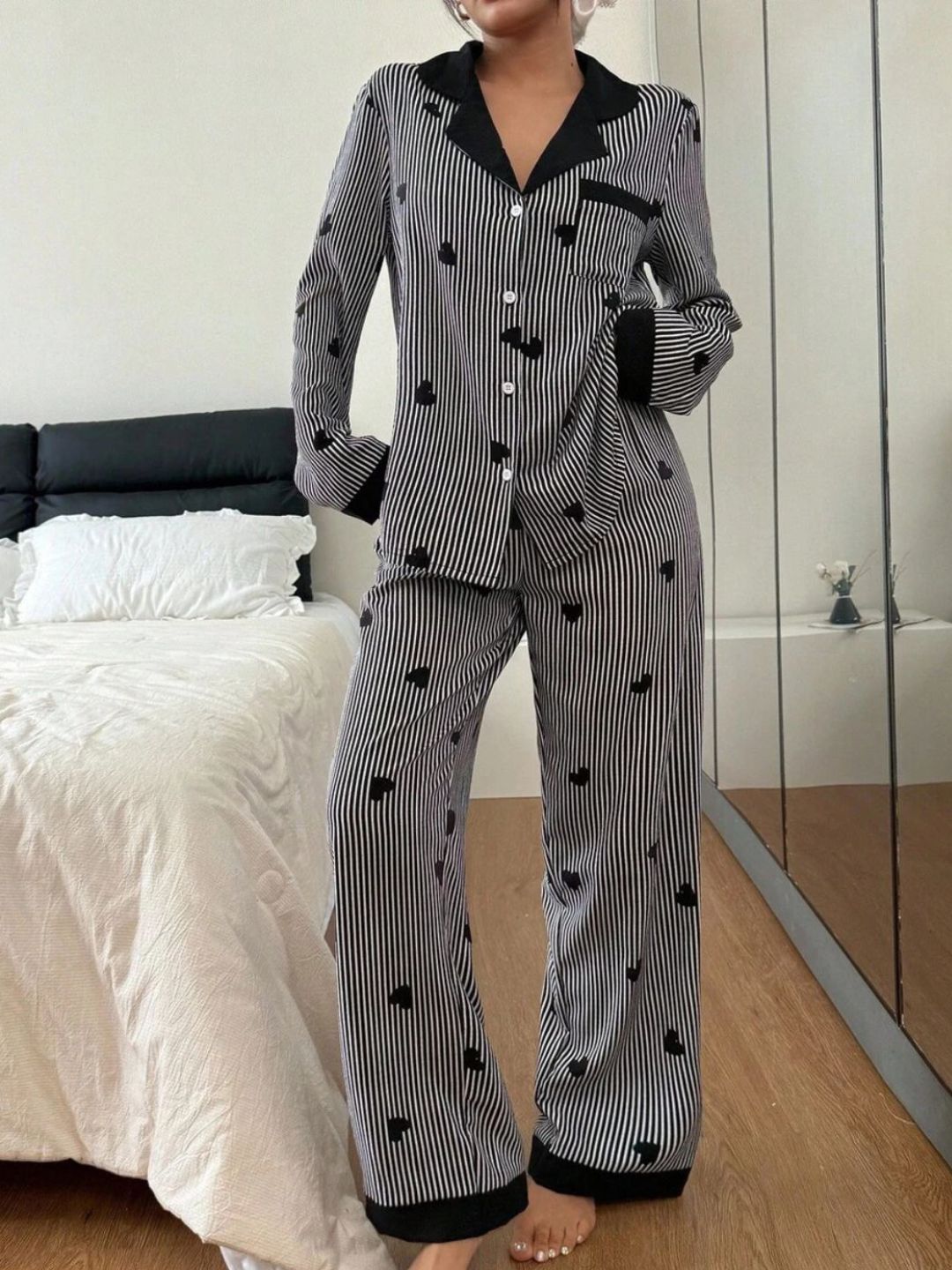 This black and white striped night suit set features an all-over heart print for a playful touch. Designed with a classic shirt-style top, it comes with a lapel collar, full button-down front, and long sleeves for a relaxed yet refined look. The matching straight-fit pyjama is finished with an elasticated waistband to ensure all-night comfort. Ideal for sleeping and lounging, this set blends style with everyday ease.