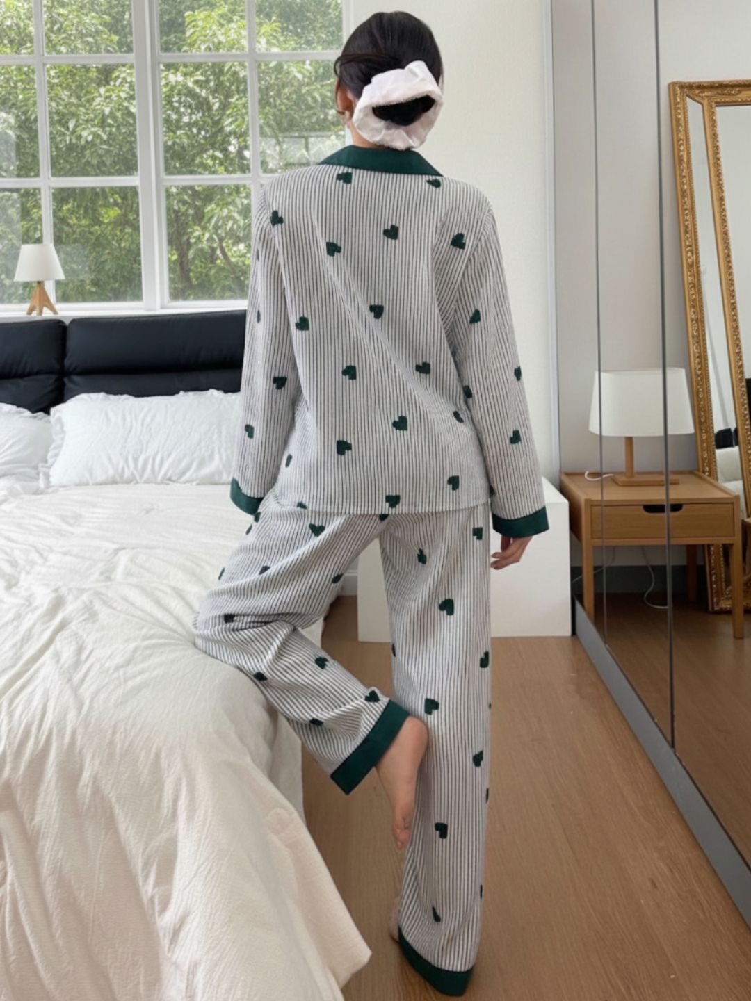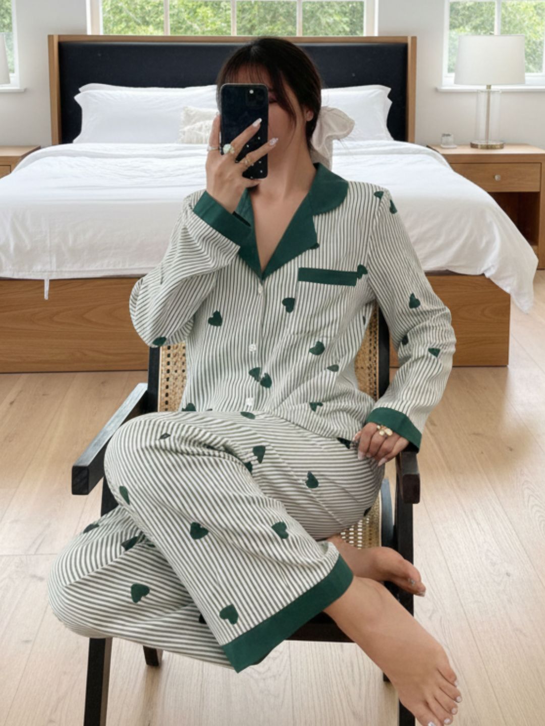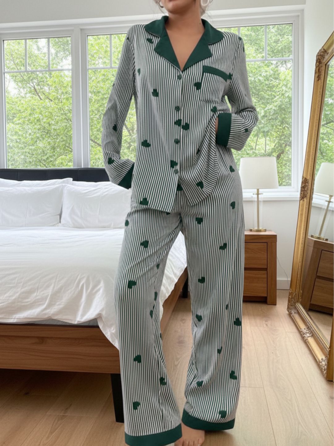 This Green and white striped night suit set features an all-over heart print for a playful touch. Designed with a classic shirt-style top, it comes with a lapel collar, full button-down front, and long sleeves for a relaxed yet refined look. The matching straight-fit pyjama is finished with an elasticated waistband to ensure all-night comfort. Ideal for sleeping and lounging, this set blends style with everyday ease.