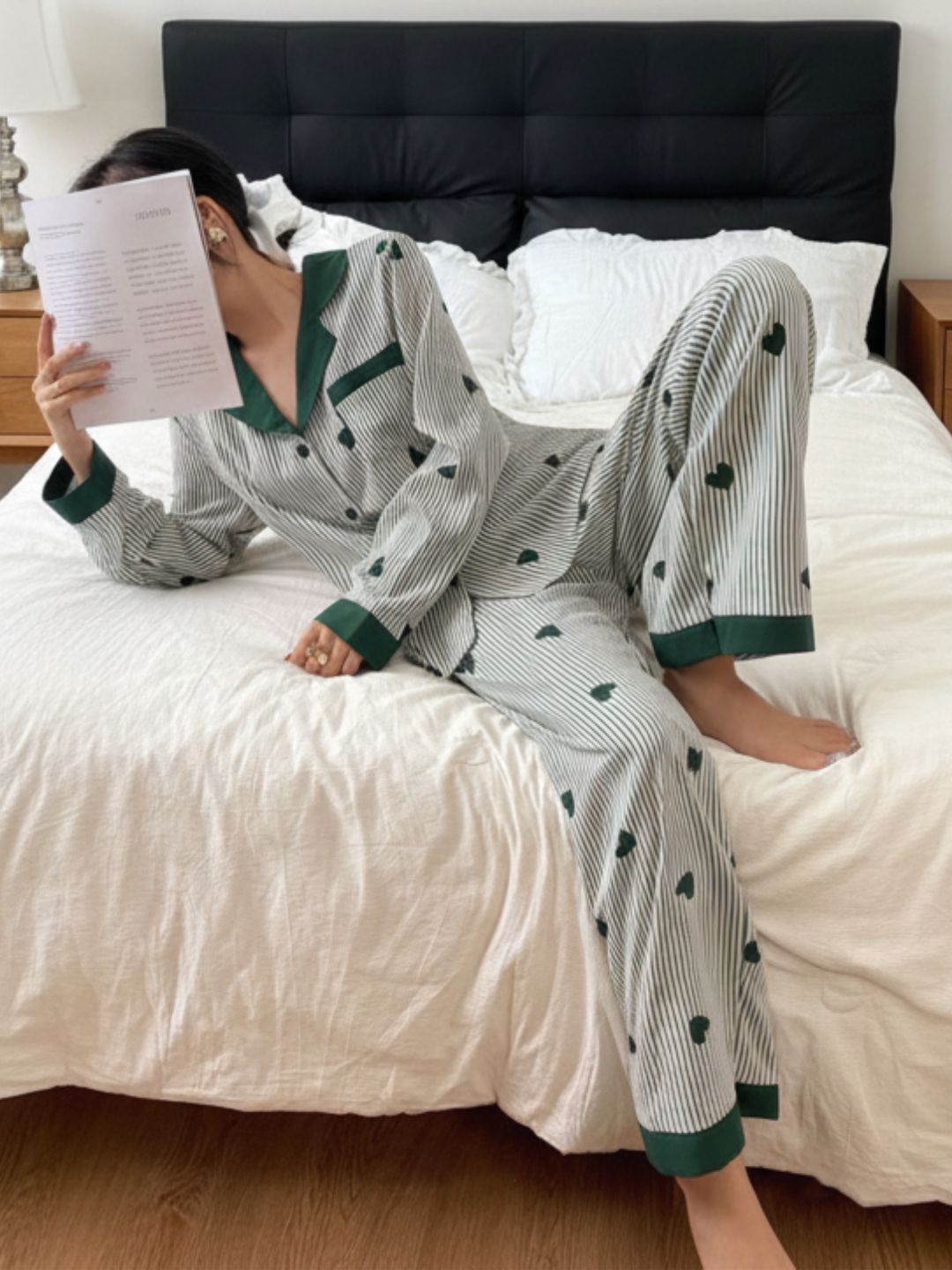 Unwind in style with this chic striped night suit featuring playful heart prints. The classic shirt silhouette paired with relaxed pyjamas gives it a polished yet cozy feel—perfect for bedtime, lazy mornings, or stylish lounging at home. Pair with soft slippers for ultimate comfort.