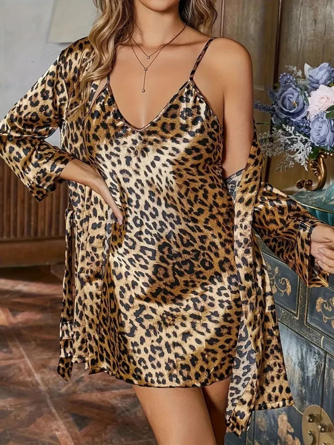 Unleash your wild side with this chic leopard-print nightwear set. The sleek slip dress pairs beautifully with the matching shrug, giving you a stylish yet effortless look. Wear it together for cozy evenings or style the slip solo on warmer nights. Perfect for women who love comfort with a bold, fashionable edge.