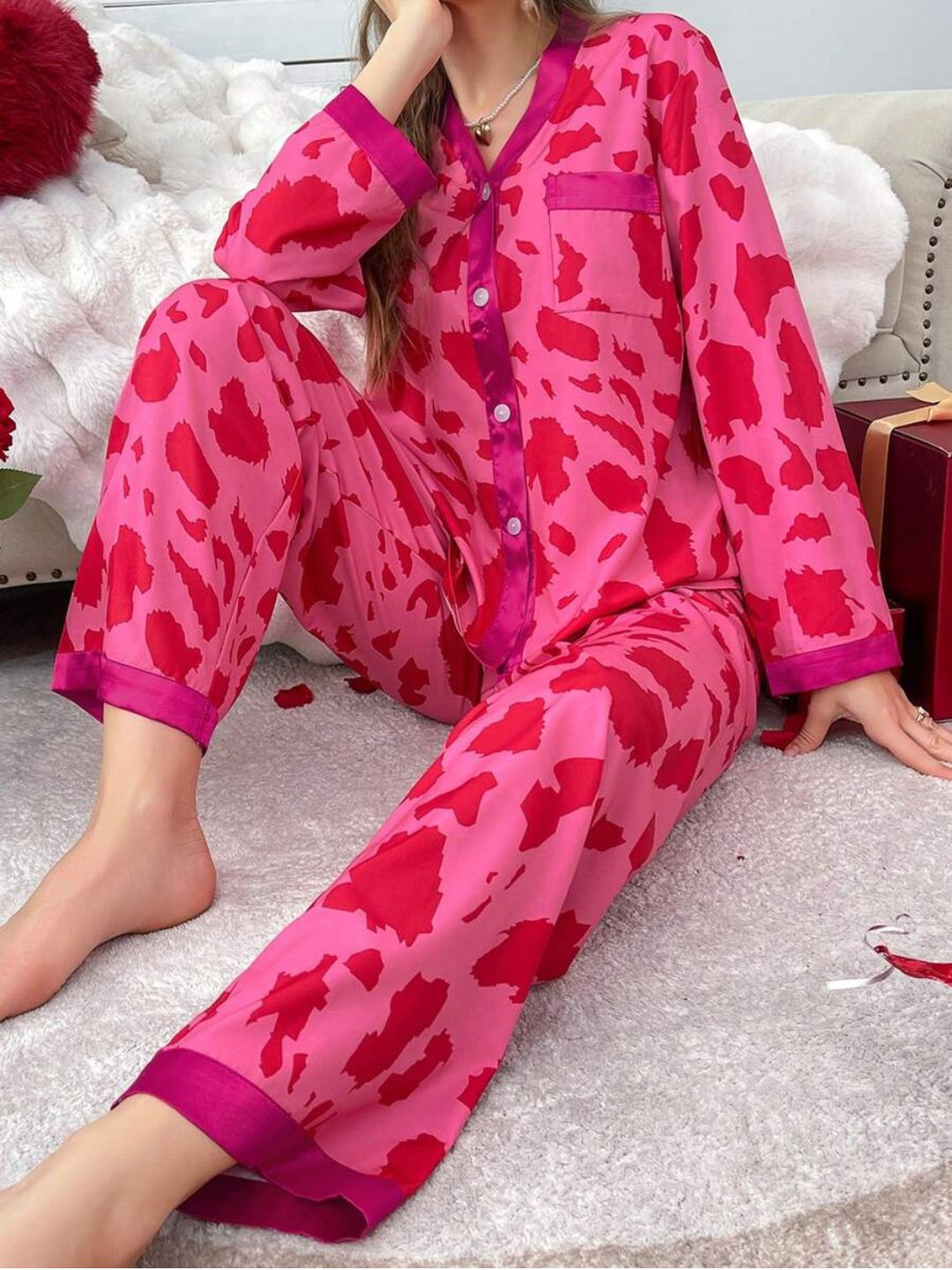 11026 - Women Pink & Red Animal Print Button-Down Night Suit