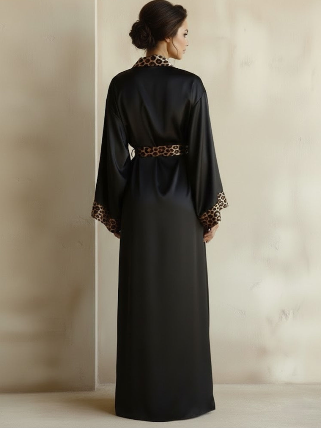 Elevate your nightwear wardrobe with this elegant black satin long robe, accented with bold leopard print trims. Designed with a flattering wrap silhouette, a deep V-neckline, and flowy bell sleeves, this robe blends comfort with luxe appeal. Ideal for lounging or layering over nightwear, it offers a soft sheen and graceful drape for effortless sophistication.
