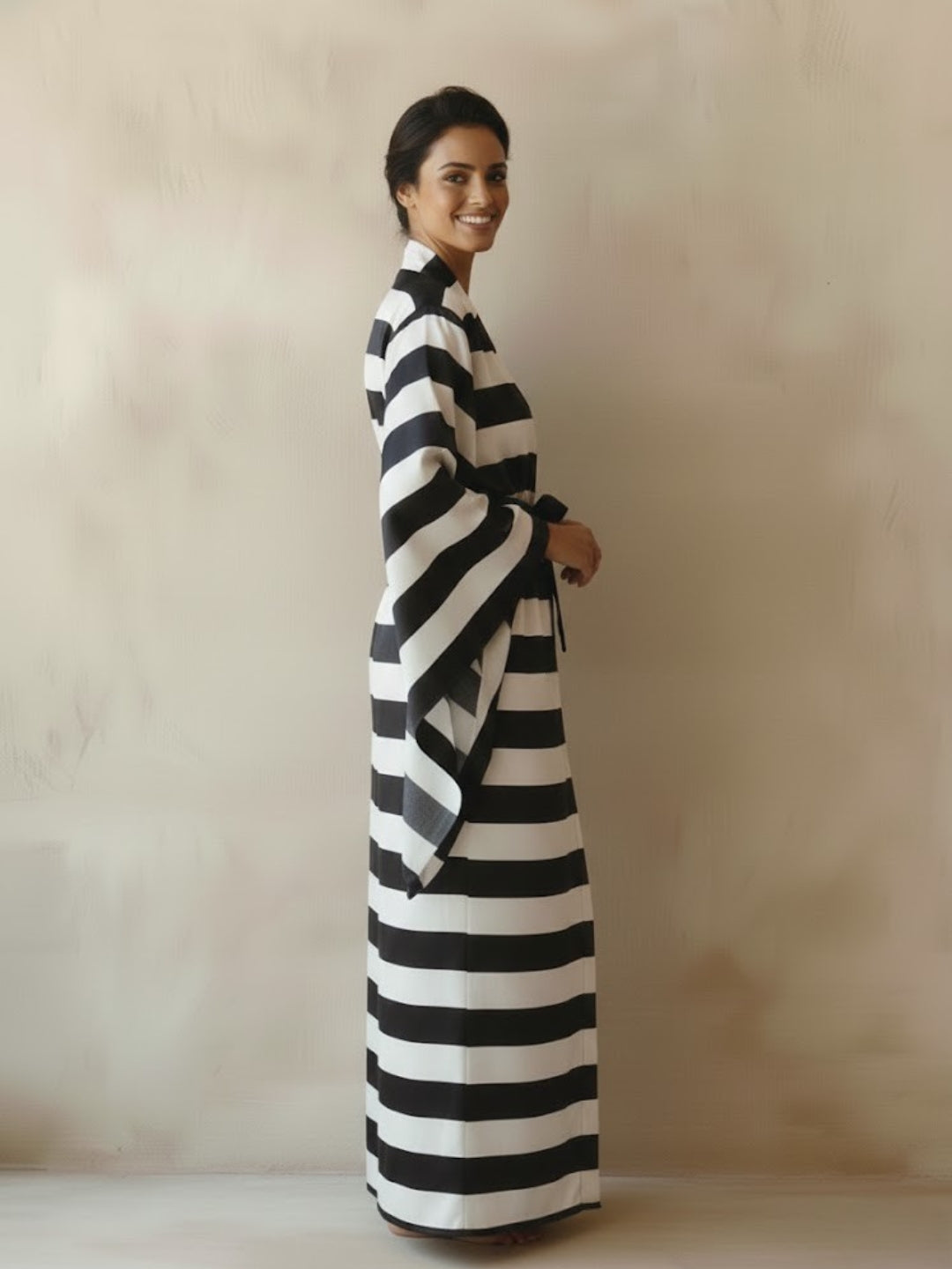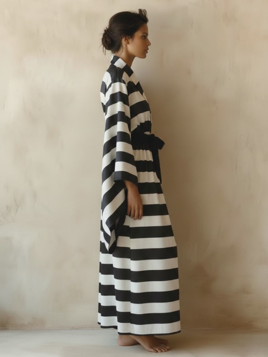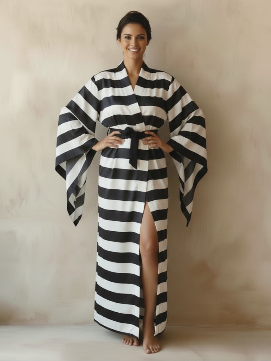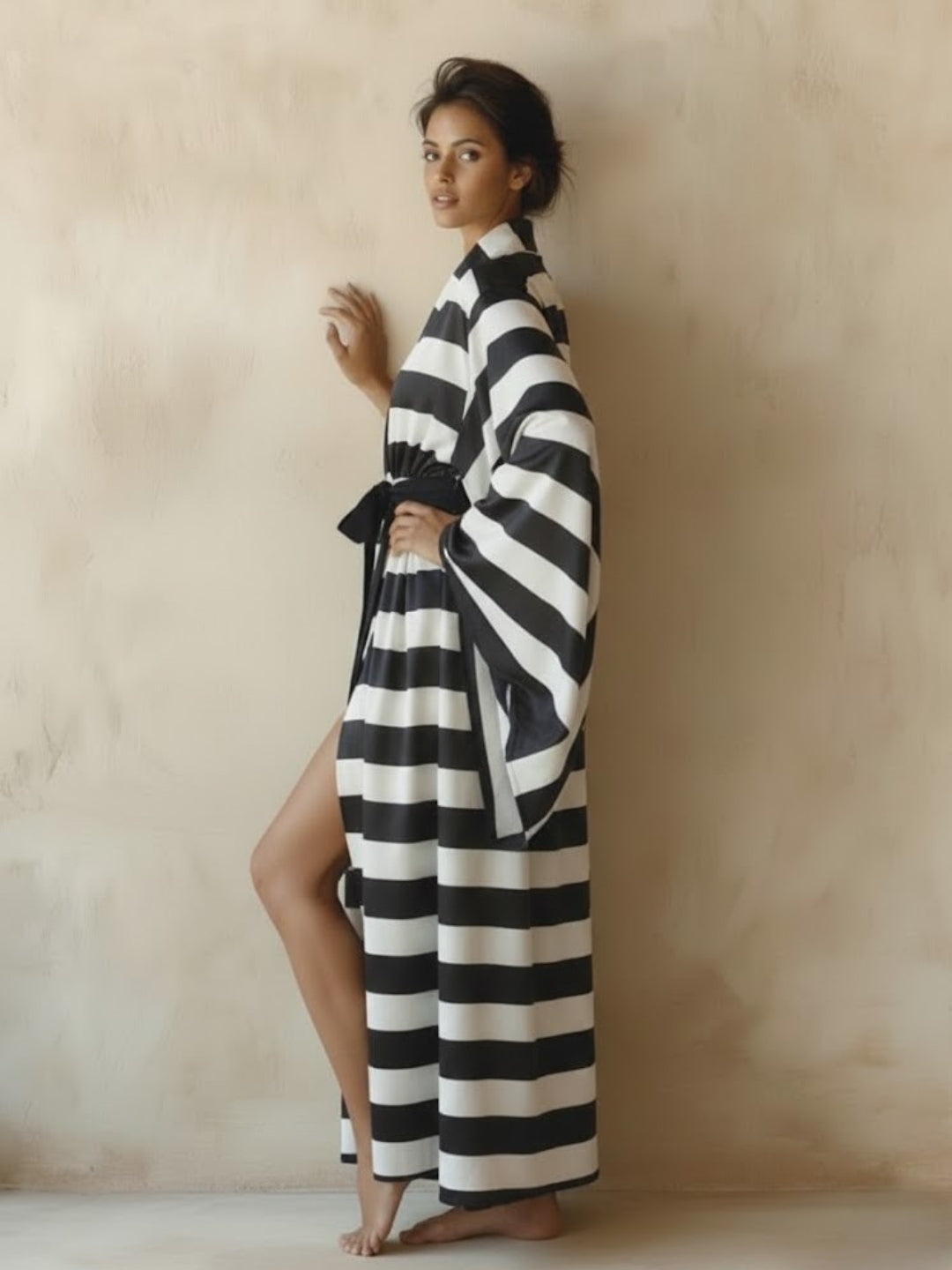 Make a bold style statement with this black and white striped satin long robe. Featuring a wrap-style front with a self-tie waist belt, it is designed with wide kimono sleeves and a flowing silhouette for a chic yet comfortable fit. The smooth satin fabric adds a subtle sheen and a luxurious feel, making it perfect for lounging, nightwear, or relaxed at-home moments.
