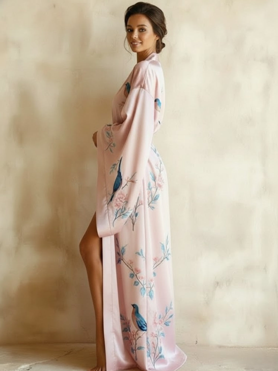 Add a touch of elegance to your nightwear collection with this blush pink satin long robe featuring delicate floral and bird prints. Designed with a wrap-style front and a self-tie waist belt, it showcases wide kimono sleeves and a fluid, graceful silhouette. The smooth satin fabric offers a soft, luxurious feel, making it perfect for lounging, relaxed evenings, or layering over nightwear.