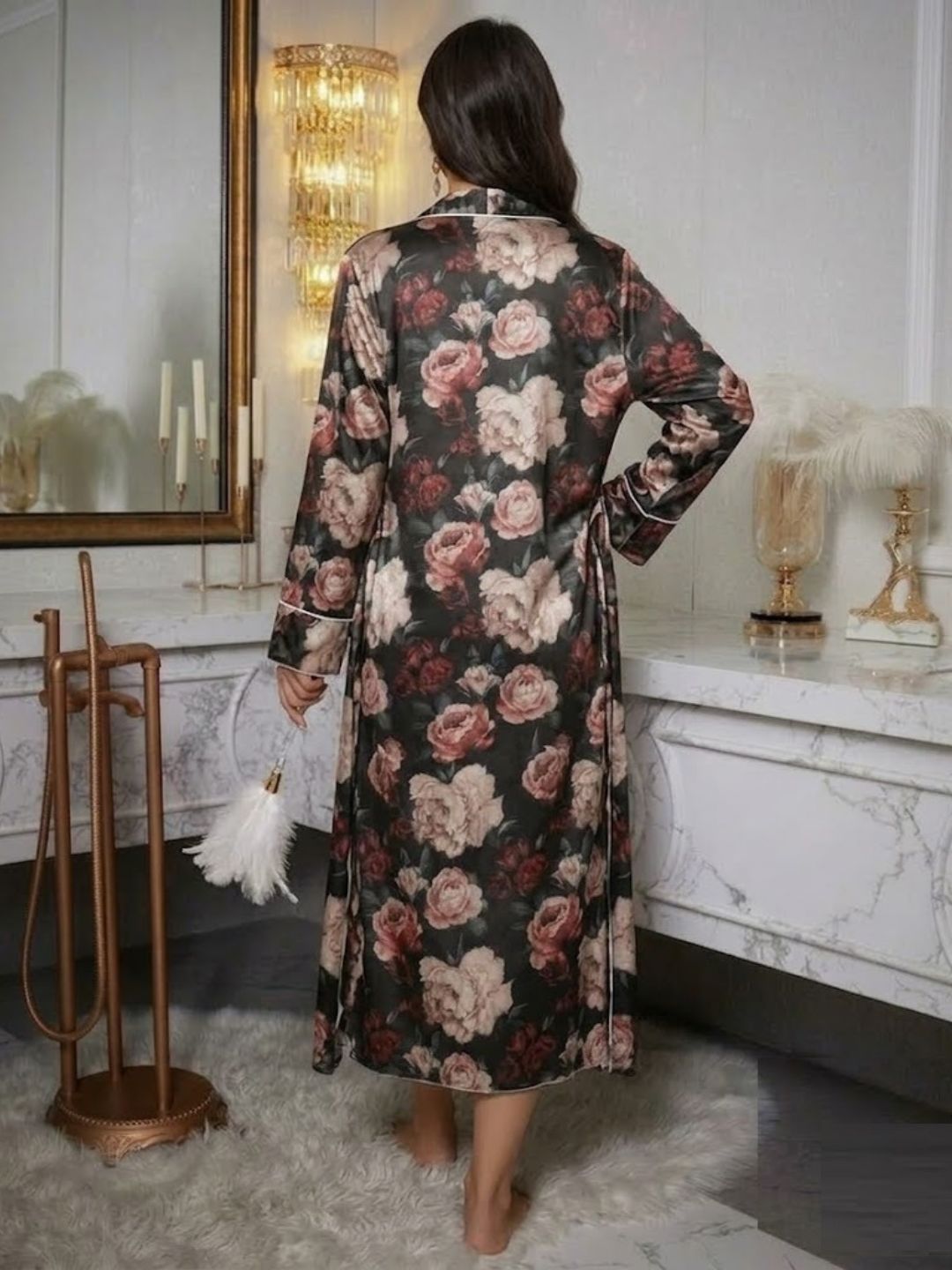 This sleepwear set includes a floral printed nightdress and a matching long robe. The nightdress is designed with shoulder straps and a flattering straight silhouette, while the robe features an open front, full-length sleeves, and a coordinated floral print for a stylish layered look. Crafted for comfort and elegance, this two-piece set offers a soft feel and a graceful drape, making it ideal for everyday nightwear and relaxed lounging.