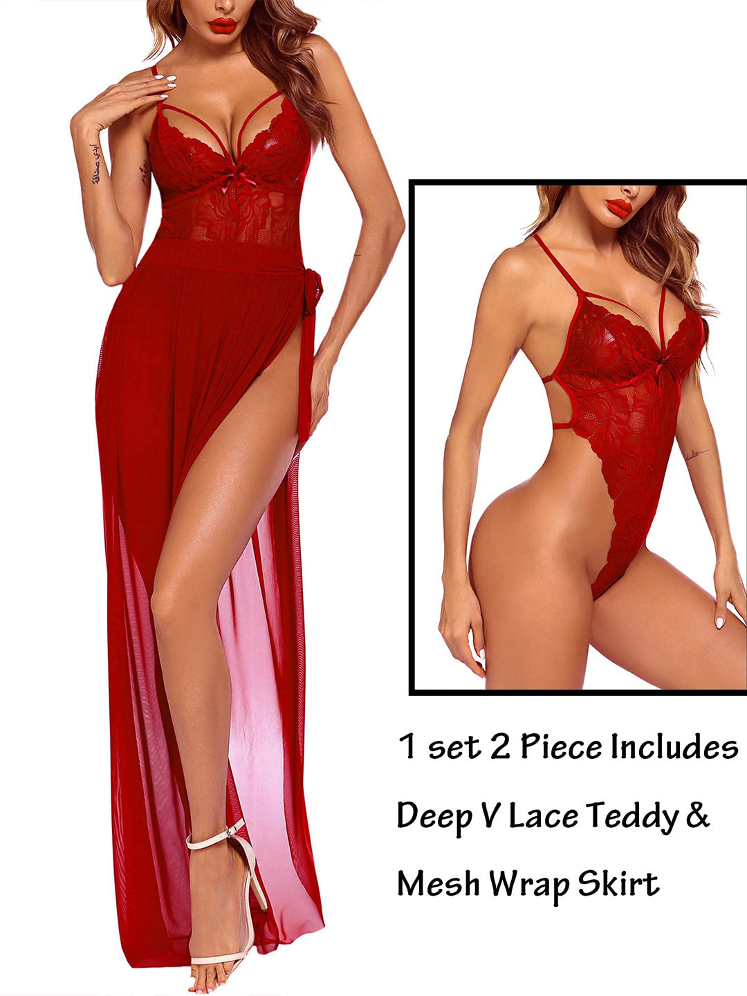 Turn up the allure with this elegant and seductive 2-piece lingerie set, perfect for romantic nights or special occasions. The deep V lace teddy flatters the silhouette while the mesh skirt adds a dramatic and ethereal touch. Pair with strappy heels or delicate accessories for a complete boudoir look.