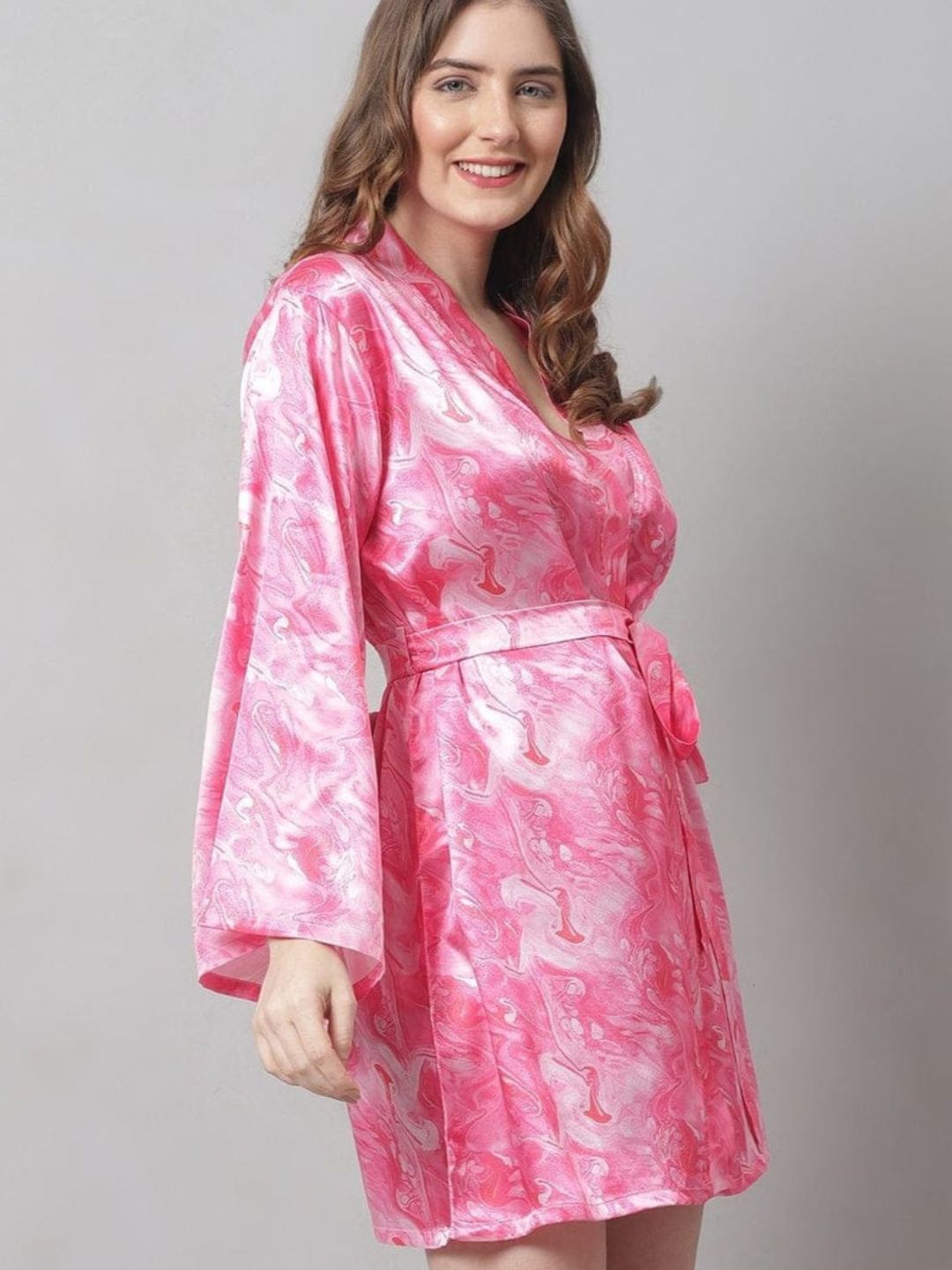 Whether you’re getting ready for the day or winding down at night, this short satin robe adds a dash of glamour to your routine. The glossy finish and fluid pattern make it a standout piece. Style it with fluffy slippers for a complete relaxed look, or layer over nightwear for an effortlessly chic vibe.
